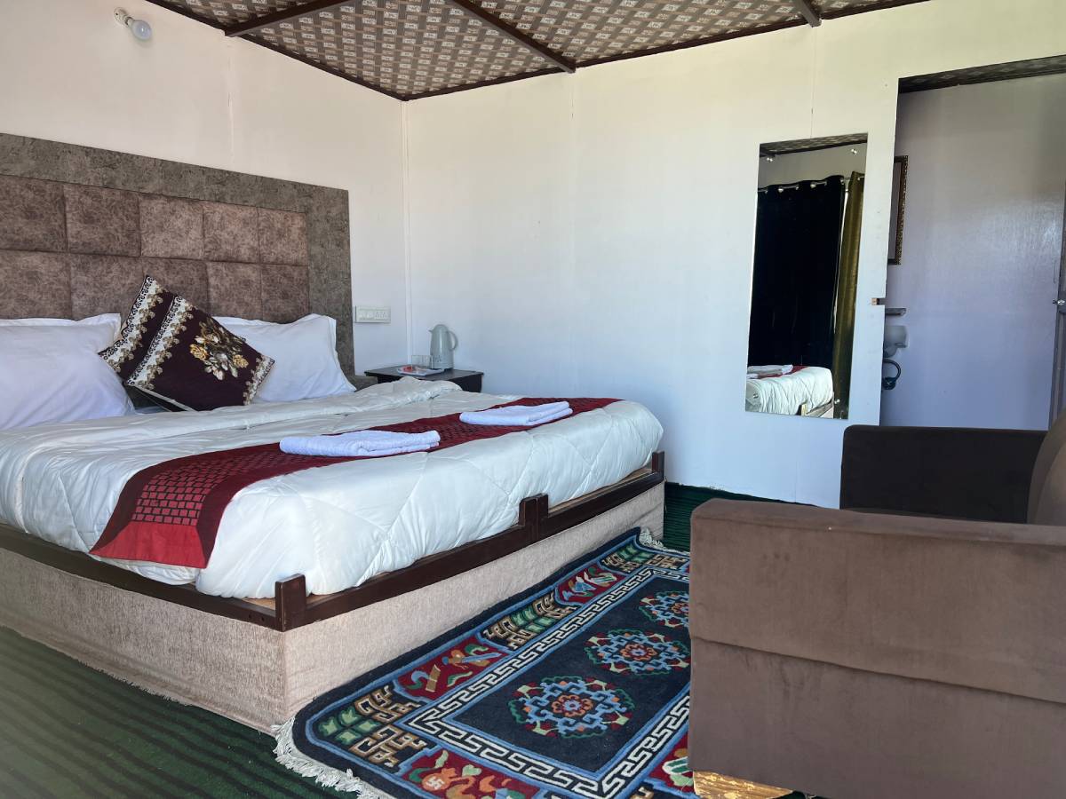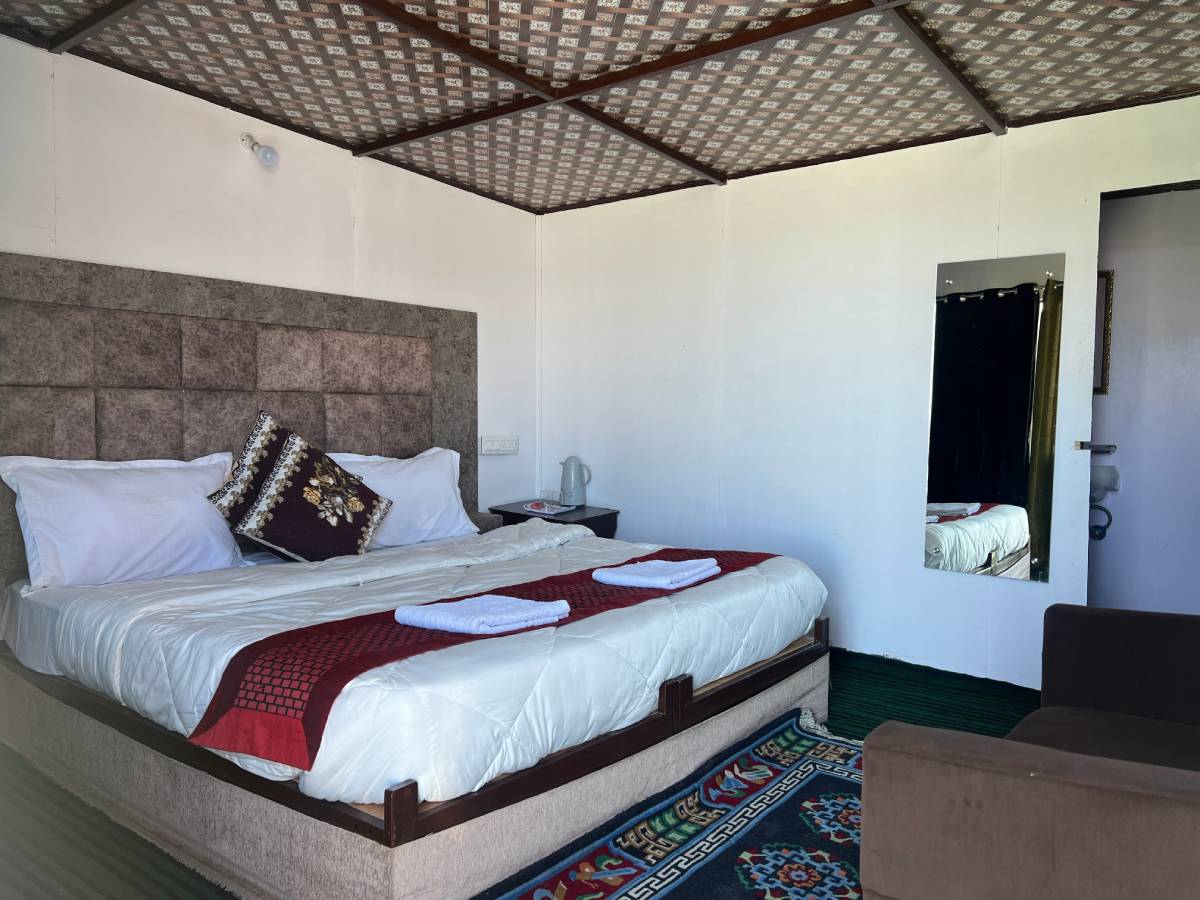 From Rs. 3,500 / NightThe Deluxe Room at Crane Valley Cottage offers a cozy and well-furnished stay with modern amenities. Enjoy stunning views of Pangong Lake while relaxing in a warm and comfortable setting. Equipped with essential facilities like hot water, an intercom, and comfortable bedding, the room ensures a peaceful retreat for travelers seeking relaxation amidst Ladakh’s serene beauty.